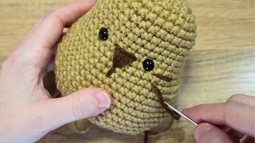 The face should be assembled midway, centering safety eyes between rounds 13 and 14 and embroidering the nose and whiskers for added character.