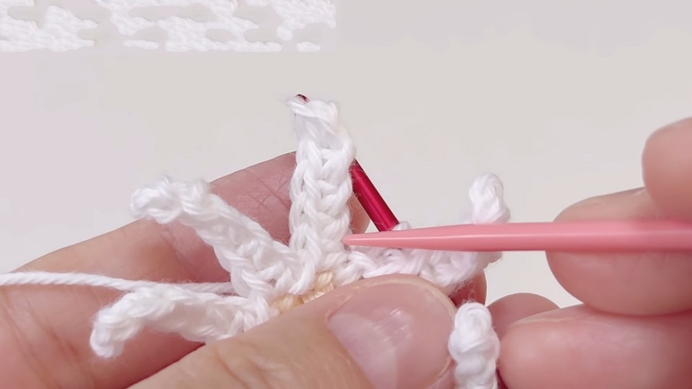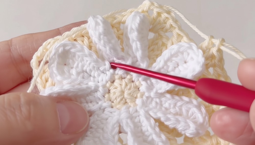 3. Insert your hook into the head of the next dc from Round 1 and secure the petal base with a sc.
