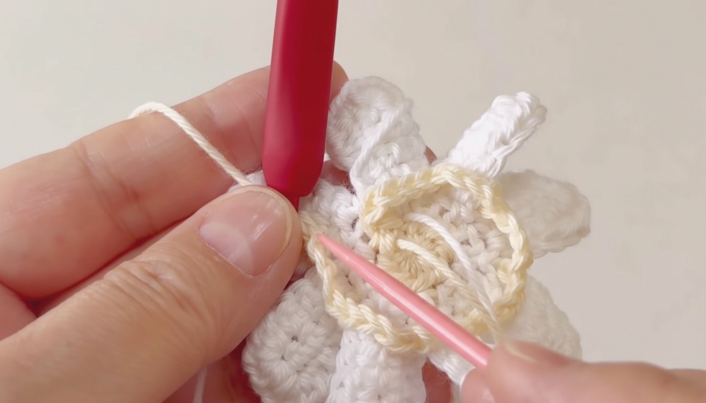 1. Attach the yellow yarn in between two petals (the base of the petal).