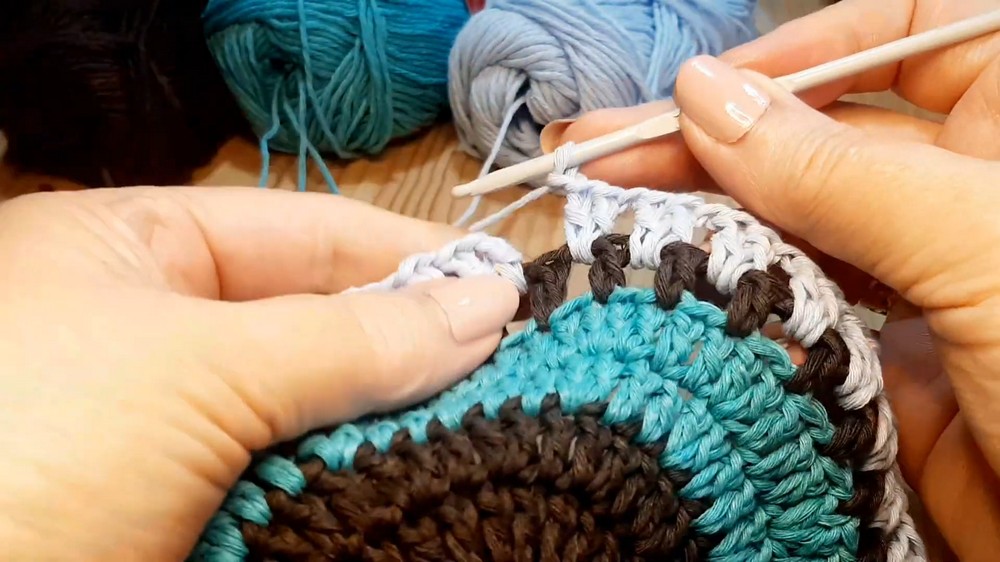 - Cotton or cotton-blend yarn in 3 colors (dark chocolate brown, pale turquoise, very pale baby blue)