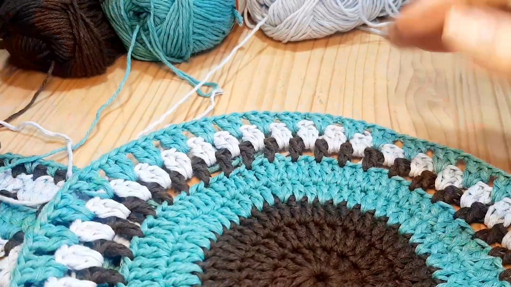 - Repeat round 7 exactly with pale turquoise and 120 stitches.