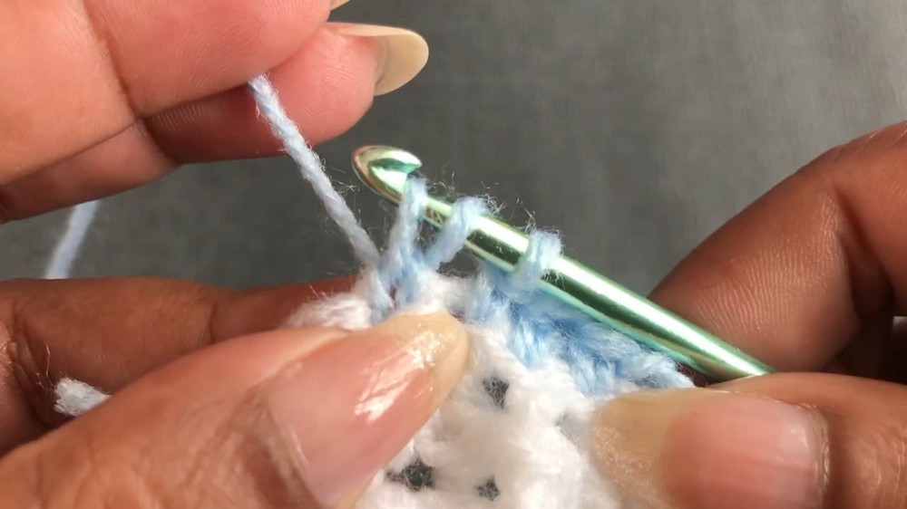 - Insert into next stitch, pull yarn up (3 loops on hook).