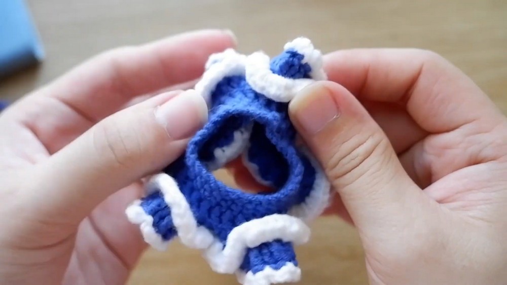 • Crochet no-increase rounds to desired length, then add white yarn round with chain stitch pattern for decoration.
