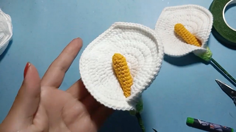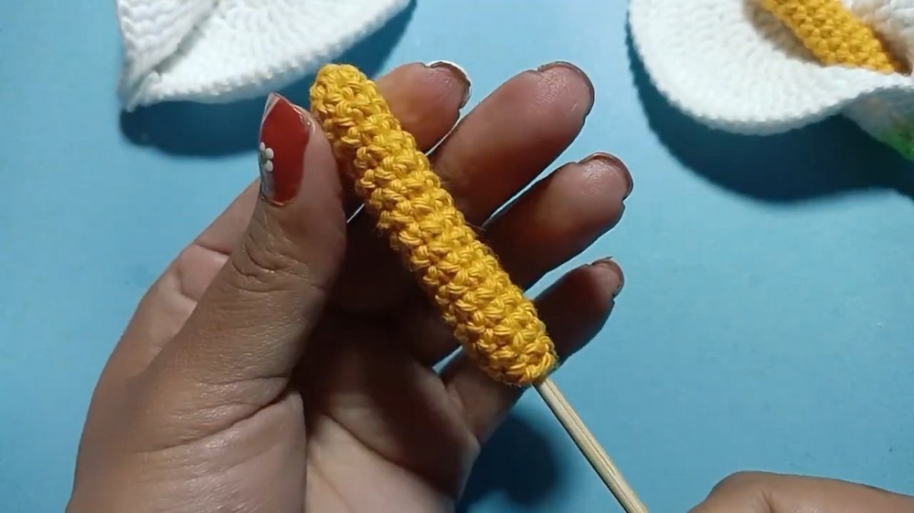 - The spadix (center) is crocheted and glued onto the stick before final assembly.