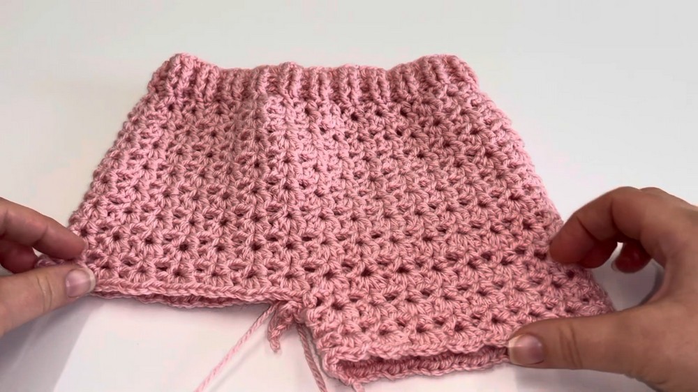 - Texture: The shorts alternate between double crochet rows and front/back post stitches, providing a subtle ribbed effect.