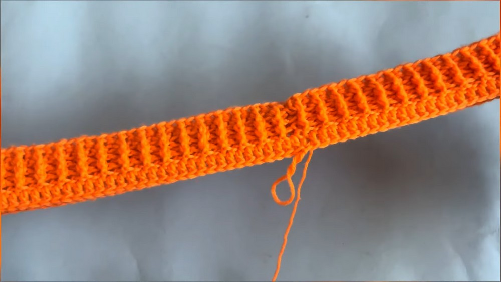 - At the end, join with a slip stitch, chain 3, and repeat for 4 rows total. This creates a stretchy waistband.