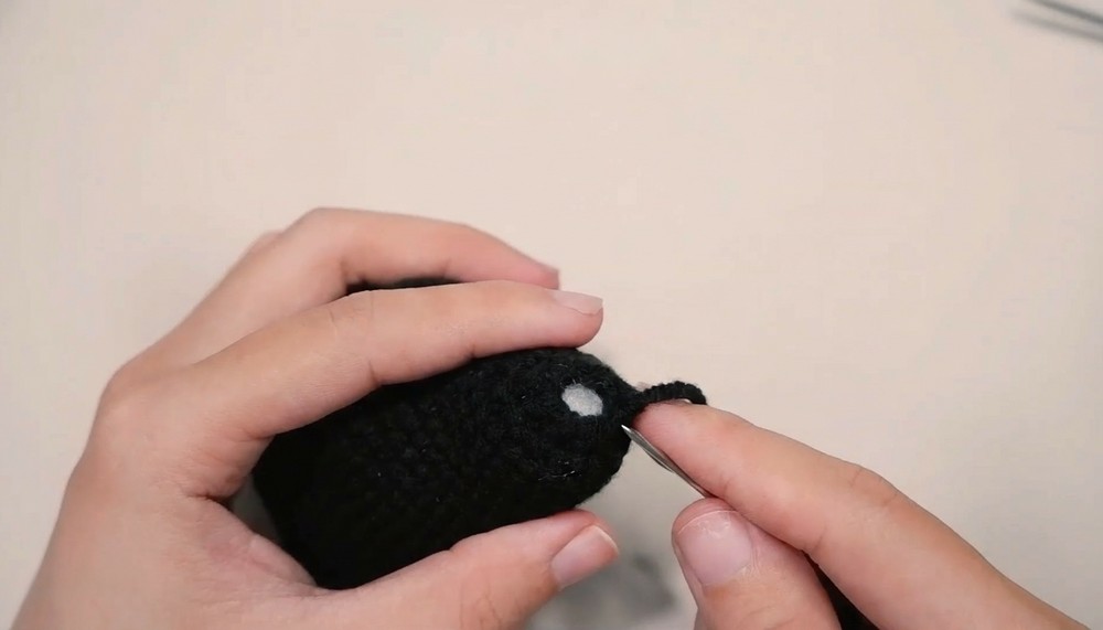 • Crochet eyelash details in black yarn.