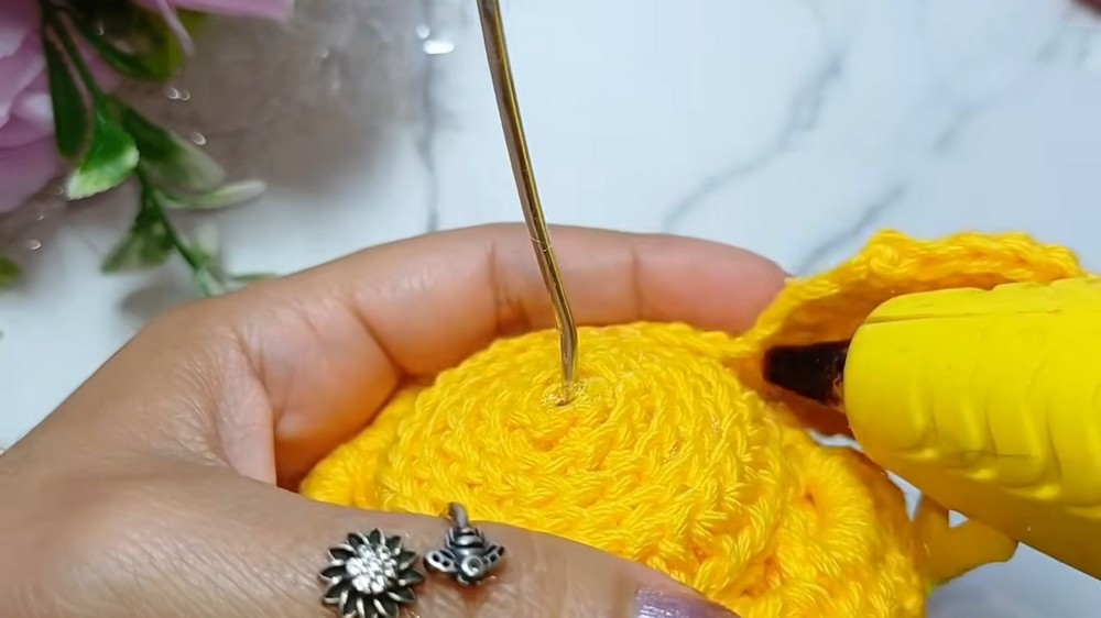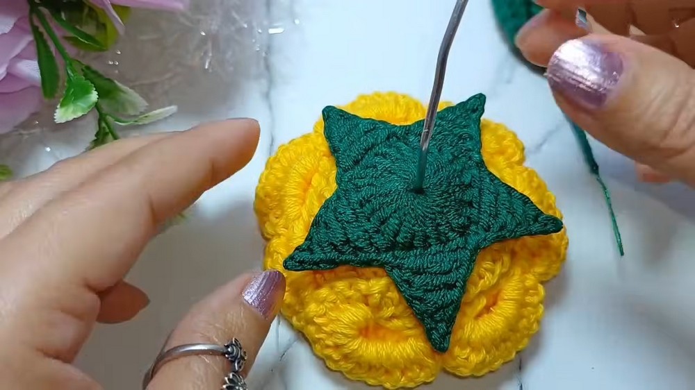 - Secure the calyx using hot glue or stitch it in place with green yarn.