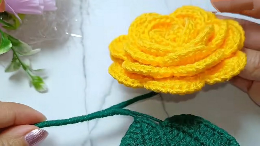 Your 3D Crochet Rose is complete, pairing realistic petals with a beautifully detailed calyx and leaves. Perfect as a decoration for vases, bouquets, or brooches, this rose combines elegance and personal touch into one project.