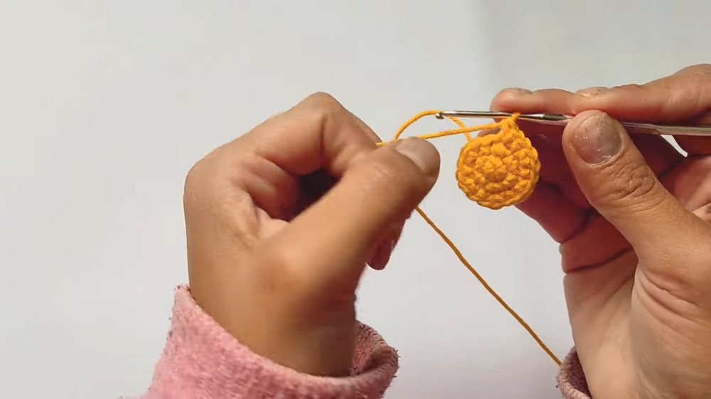 • Wrap the yellow yarn over your index finger to create a loop. Insert the hook into the loop, pull the yarn, and secure with a chain.