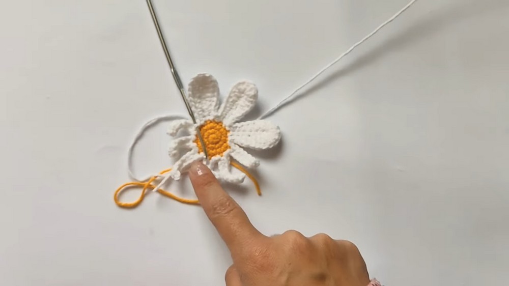 • Make a slip knot with the white yarn. Insert your hook into any stitch of the yellow center, pull the white yarn through, and secure.
