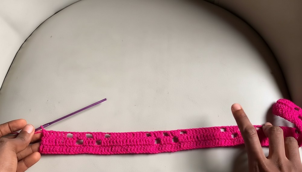 - Repeat the chain 2 + 4 dc + chain 2 + 17 dc block pattern across.