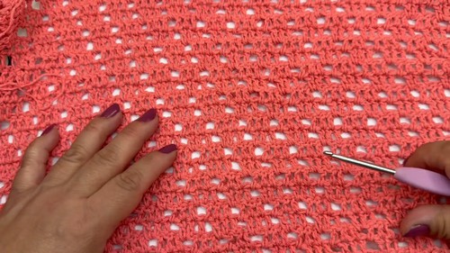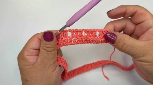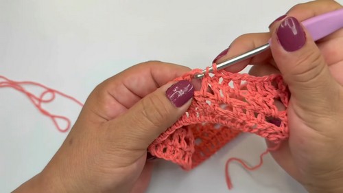 - Repeat pattern (3 dc, ch 1, sk next st, 3 dc) across the row.