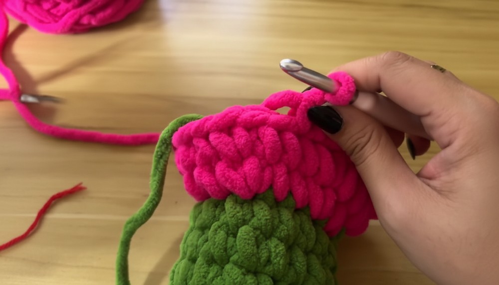 - At the end of round 10, slip stitch with new pink yarn, working over previous green yarn tail.