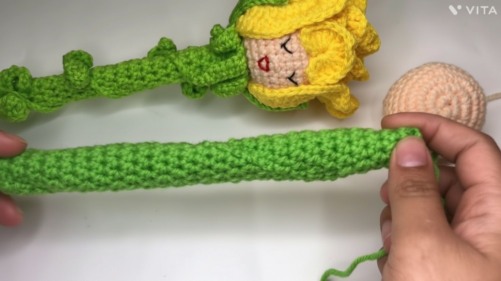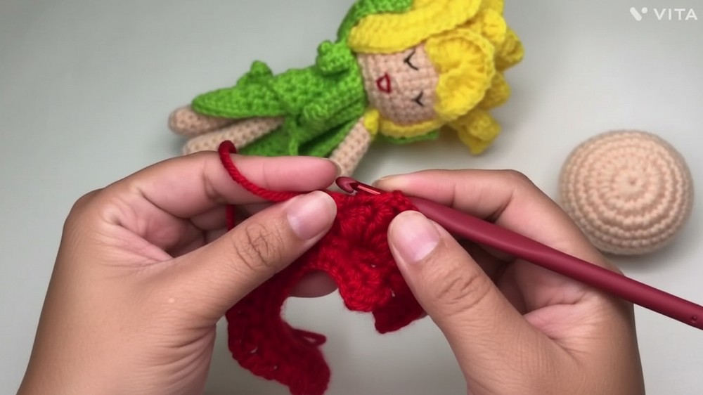 - Next row: sc in 2nd ch, hdc in next ch, dc in next 3 ch, hdc in next ch, sc in next ch (leaf formed).