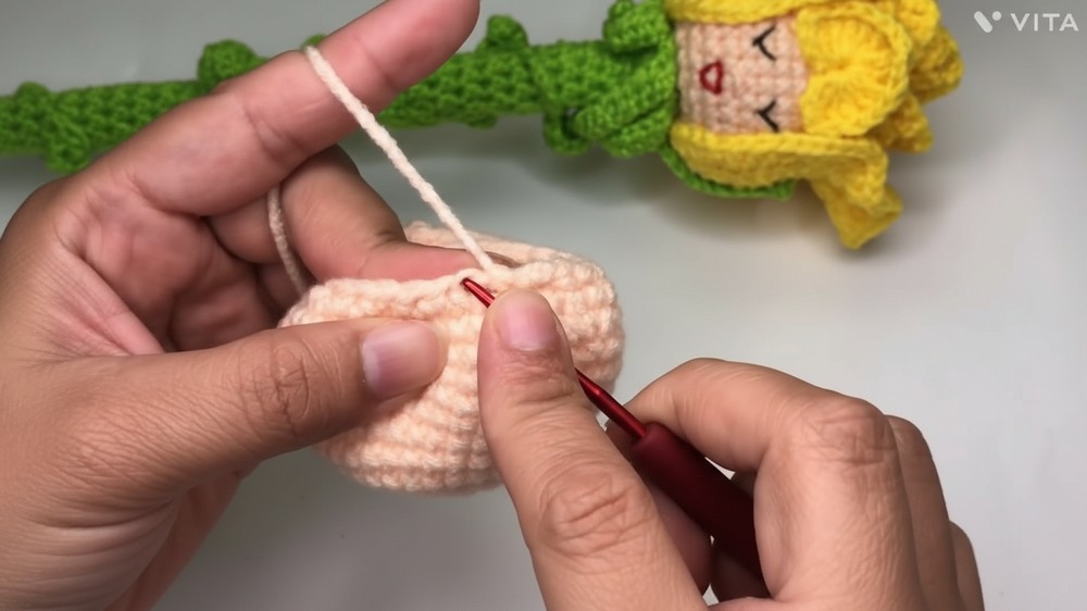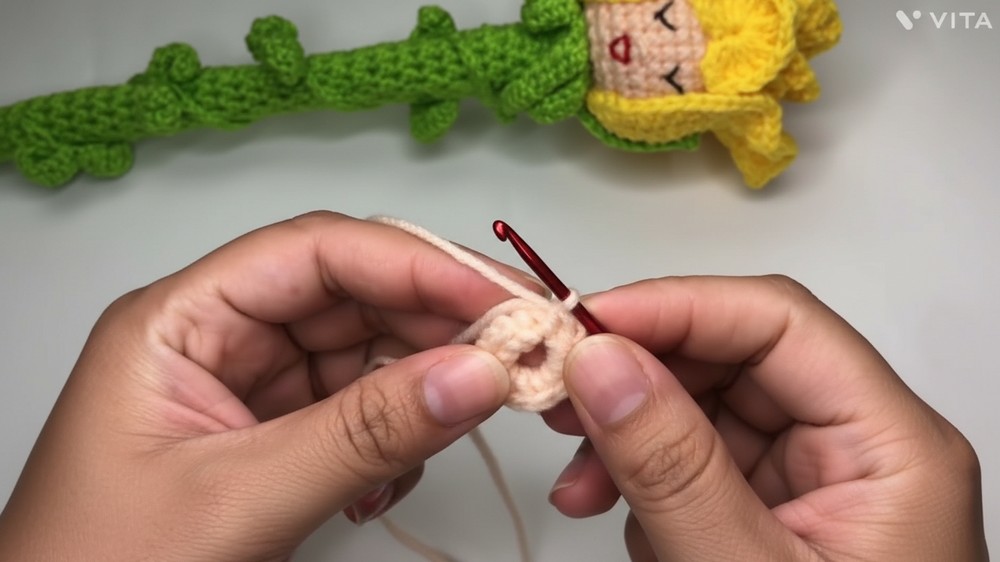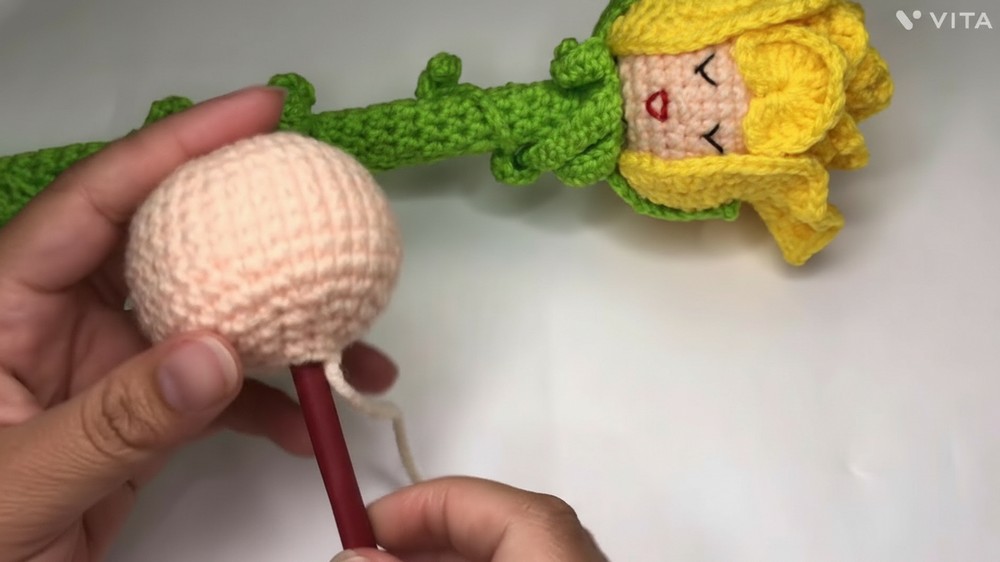 - Ensure magic ring is closed securely; do not close head’s final hole completely so stick can be inserted.
