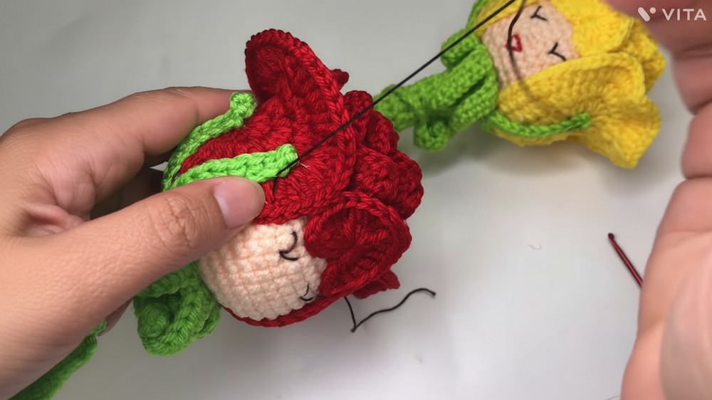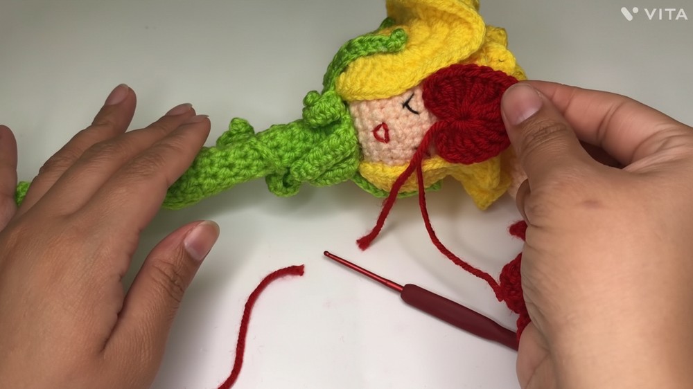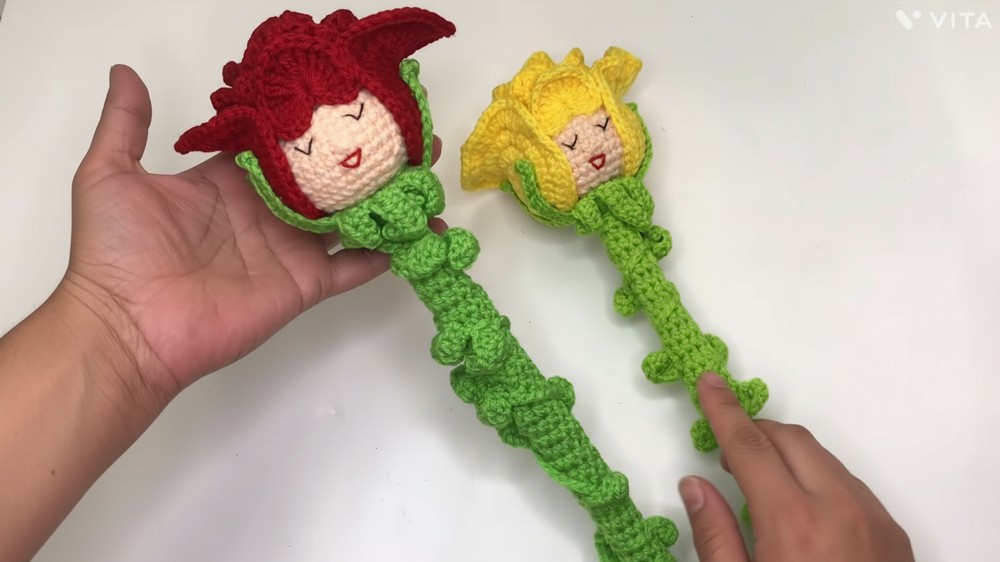 This crochet rose includes amigurumi techniques for a sturdy “head,” fancy petal arrangements, and realistic seamed calyx and leaf elements. The thick covered stem provides durability and realism, perfect for gifts or home display.