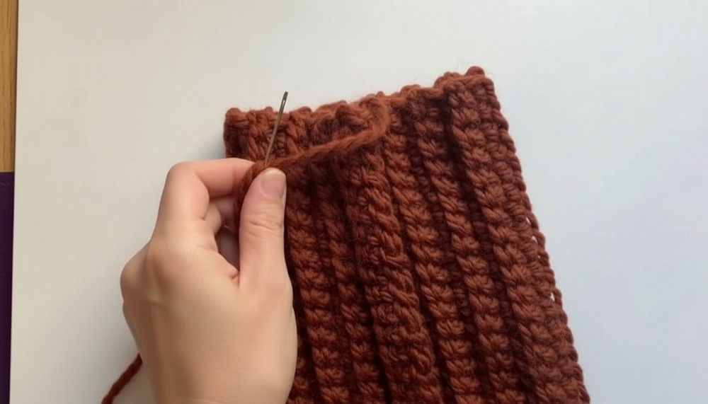 - Using a tapestry needle, sew the short edges of the rectangle together by inserting the needle into the front loops of each stitch to create a neat seam.