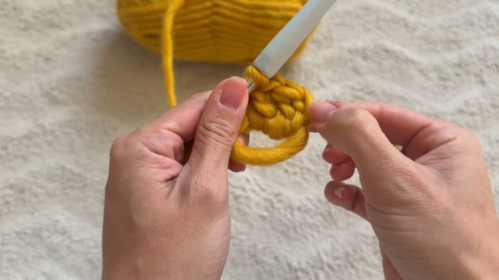 To begin this Crochet Bucket Hat pattern, start with a magic circle and work 10 double crochets into the center, pulling tight to close the gap.