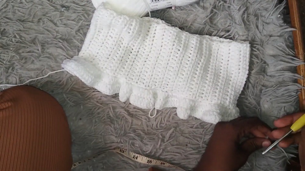 • Join edges using single crochet (sc) stitches along the side seam to form a waistband loop.