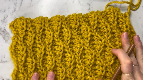 The finished scarf will have a beautiful textured pattern enabled by the alternating stitches of the Armond stitch. One side will have a subtle wave-like appearance, while the other will look more linear and bubbly.