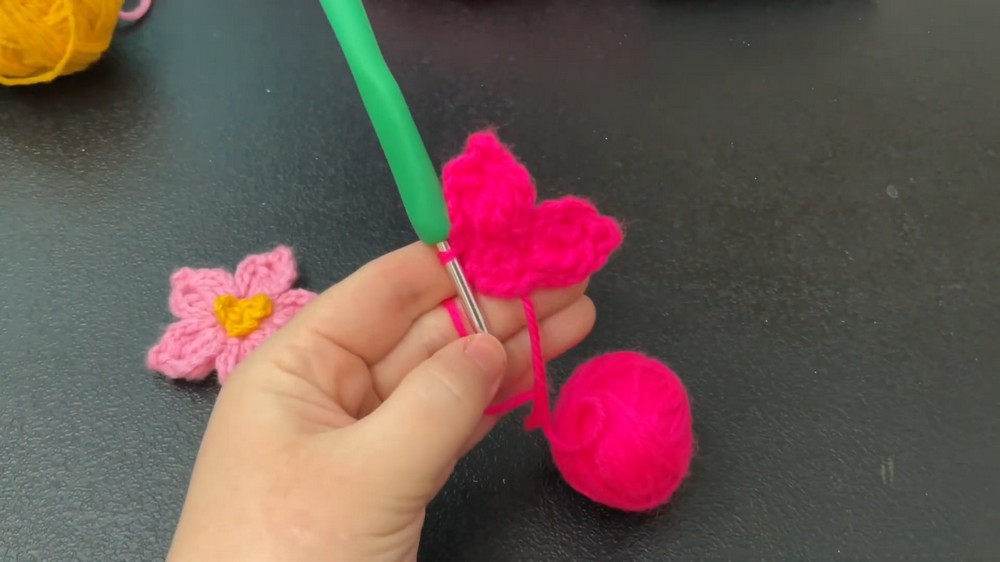 Yarn: 4 mm medium-weight yarn (the tutor uses neon pink for the flower and yellow for the center).