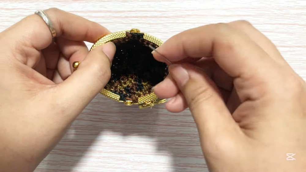 • Sew the purse to the frame using a running stitch, securing through each frame hole and the corresponding crocheted edge.