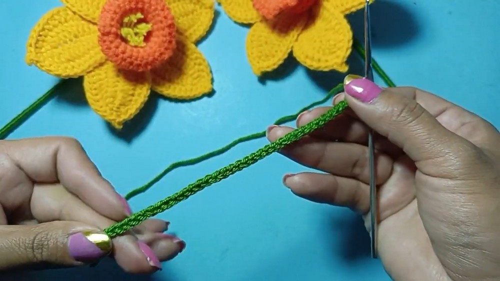 • Wrap green yarn around petal/trumpet wire ends for neat finish.