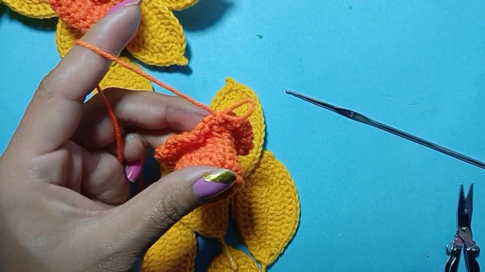 1. Center: Create yellow thread “stamens” by wrapping yellow thread ~8 times around fingers, snip one side, then twist the middle with a wire.