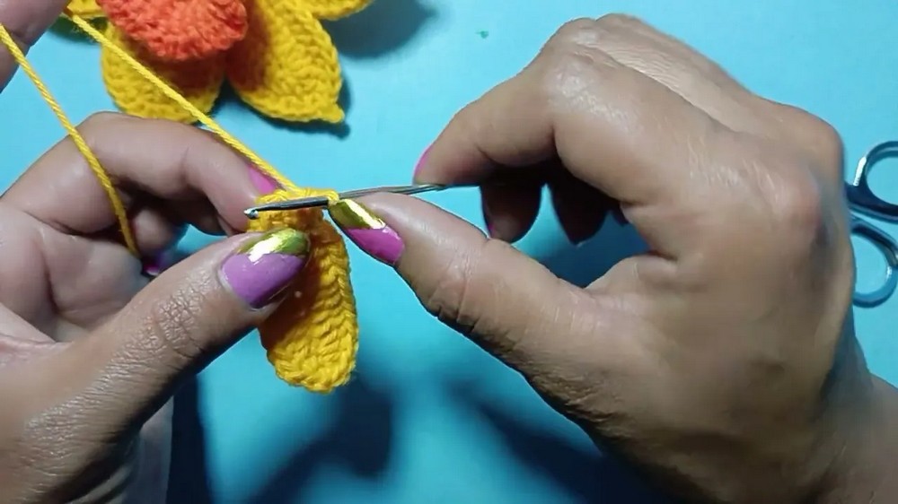 • Working with wire along the edge, sc along one side up, around tip, and down the other side.