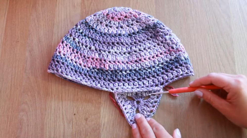 - Use slip stitches to attach the edges of the triangle to corresponding chain spaces on the hat.