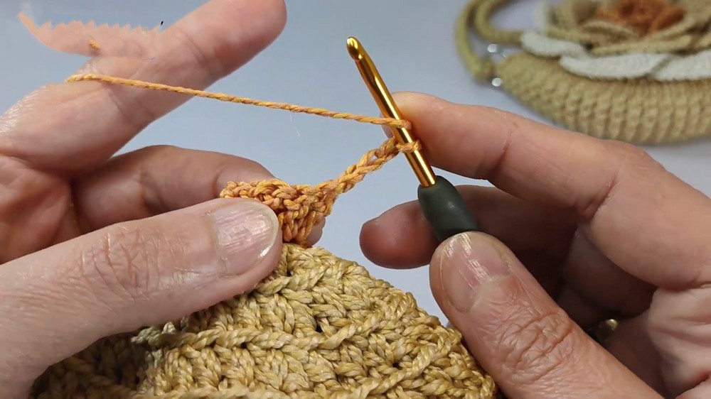 - Work 3 chains, then pull thread through each chain using a puff stitch technique to create a sturdy handle.