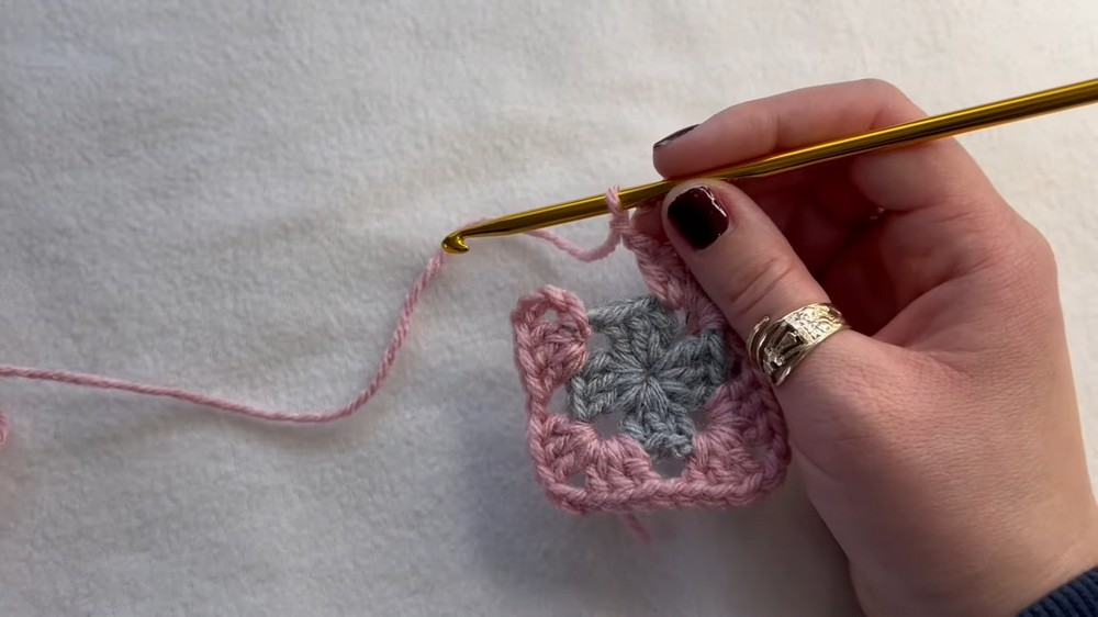 - Insert hook into corner chain of first square, then second square.