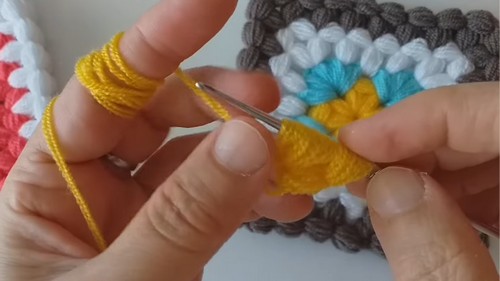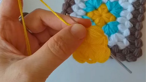 5. This round increases your motif slightly; you will have three puffs in each corner and puffs between.