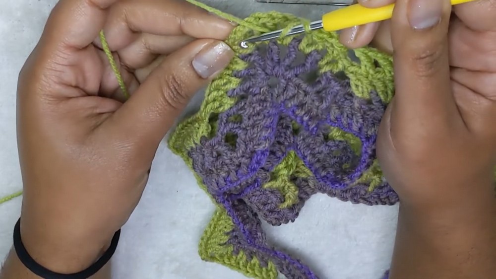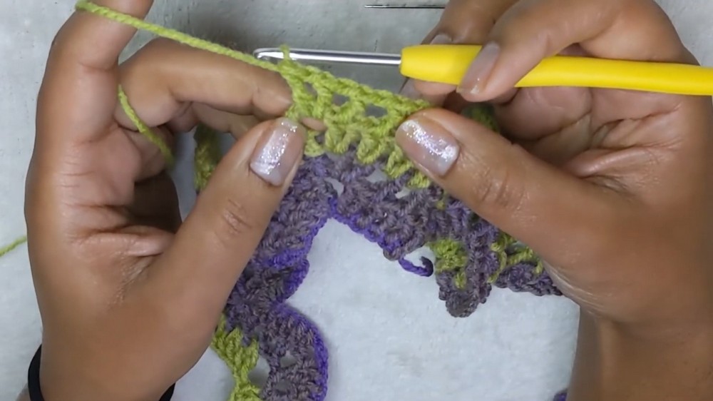 - At the valley, skip the corresponding spaces to maintain the chevron shape (skip 5 stitches total).