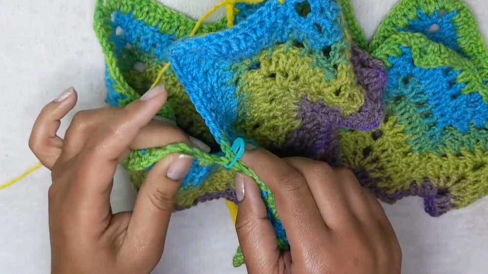 - Using stitch markers, mark 2 peaks for each armhole and align them at the front and back.