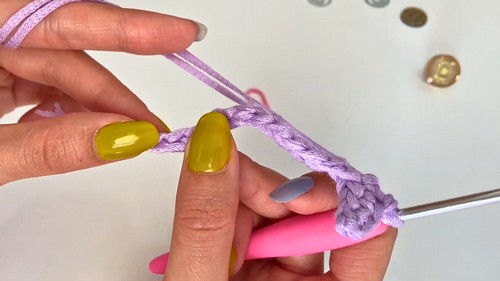 - Working into the back bumps of the chain, sc in the 2nd ch from hook (not the first one), sc across each chain to the end.