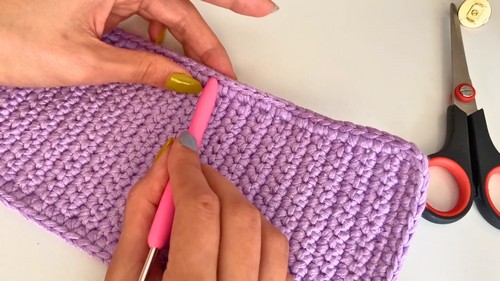 - Use stitch markers or clips to hold side edges together if needed.