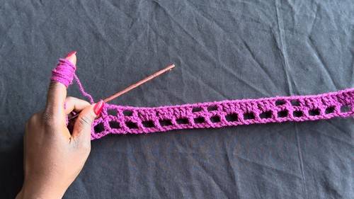 - Repeat alternating 10 solid DC stitches and mesh (5 stitches) until the end of the row.