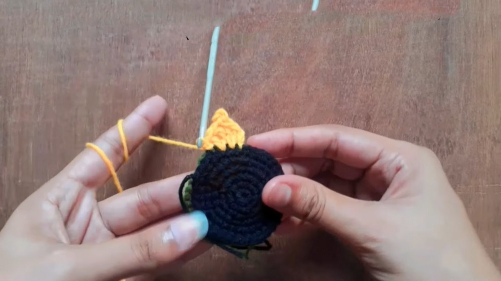 - Insert the hook through both bases (to keep them attached). Pull the yellowish-orange yarn through and secure with a chain (ch 1).