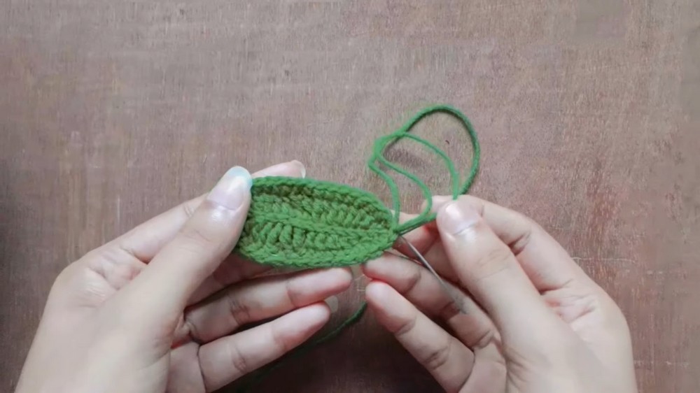 To make the leaf symmetrical, work along the opposite side of the foundation chain using the same stitch progression: 1 sc, 1 hdc, 4 dc, 3 tr, 4 dc, 1 hdc, 1 sc.