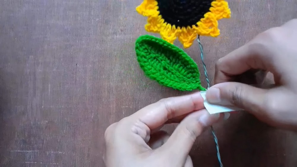 Attach floral wire along the center of the leaf using single crochets to allow bending.