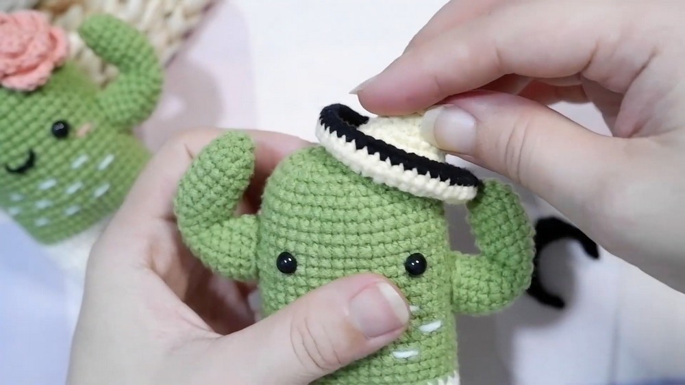 - Embroider floral patterns on cactus body with blue yarn in spaced rows.