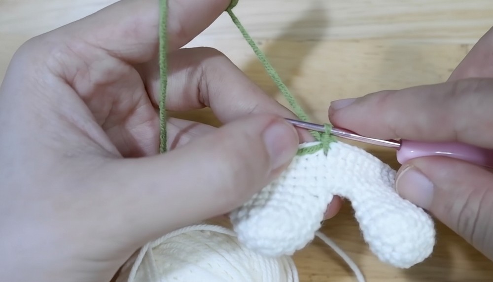 - For the second leg, after Round 7, do not fasten off; chain 3 and join it with the first leg by crocheting into the first leg’s stitch. Mark the seam with a stitch marker.