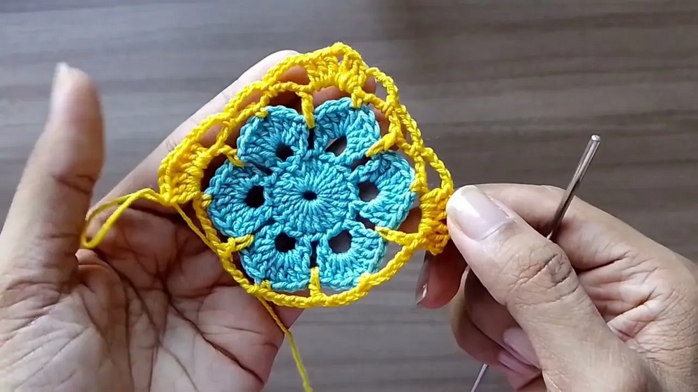 Start by forming a small flower with petals from a magic ring, working loops and chains into intricate shapes. Switch to another yarn color to extend the motif into a square.