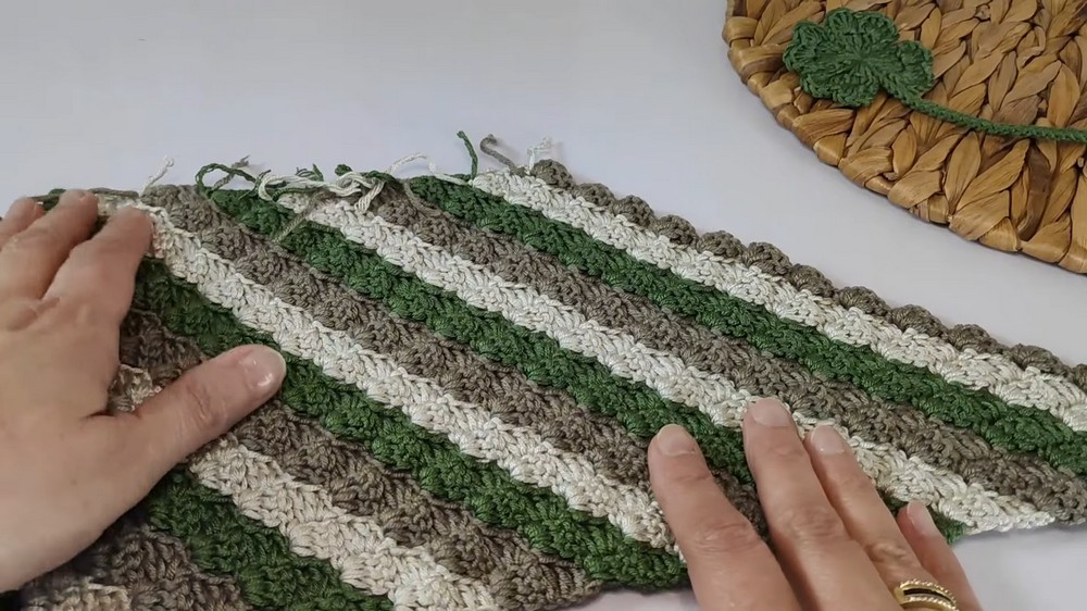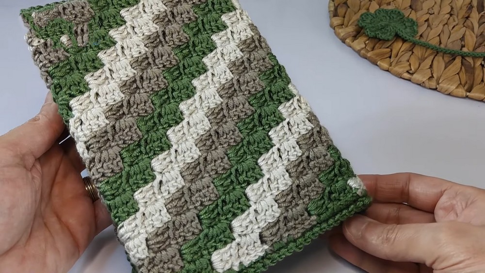 • The pattern combines double crochets, slip stitches, and three-column repeats, giving the cover a neat and uniform texture.
