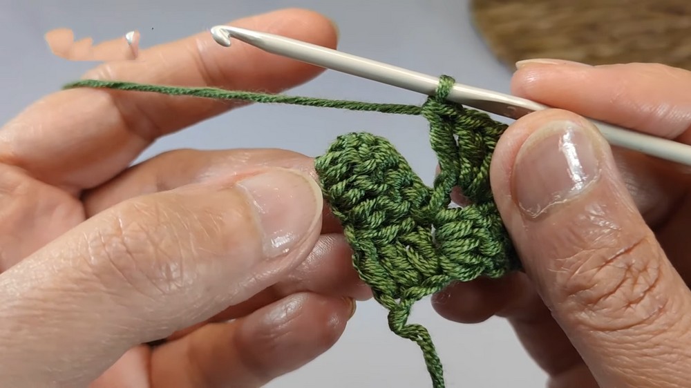 • Double crochet into the 4th, 5th, and 6th chains from the hook.