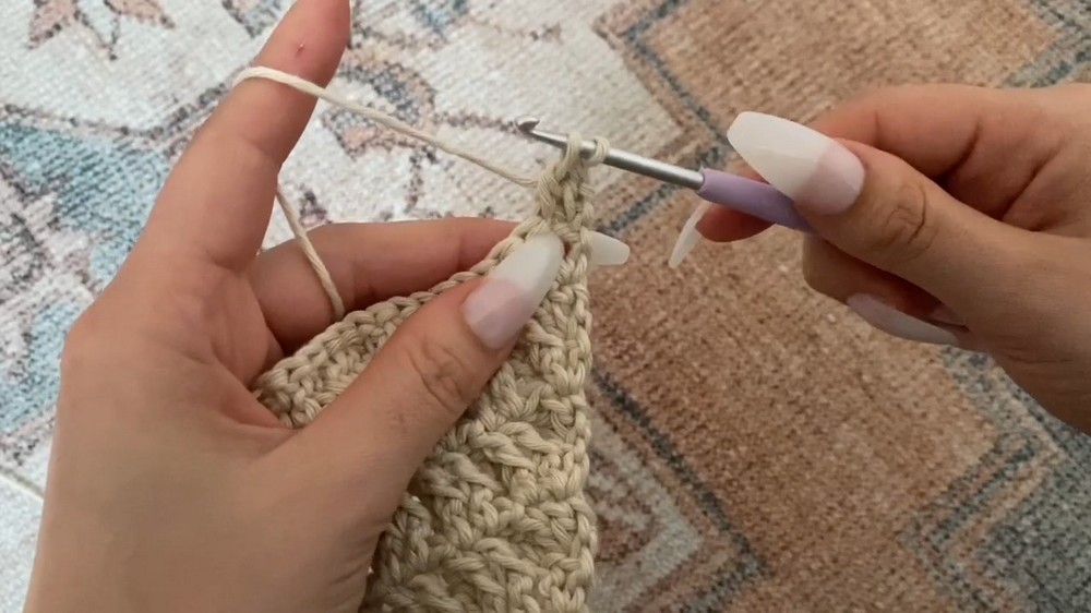 - Follow the waffle stitch pattern, alternating between back-post double crochet and regular double crochet stitches based on which side you’re working on.