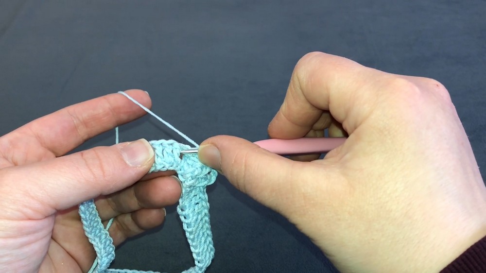 - Skip 1 stitch. In the next stitch, work 2 dc into the same stitch.