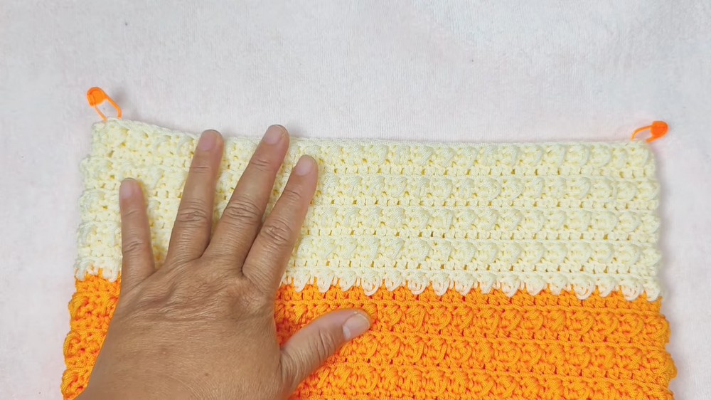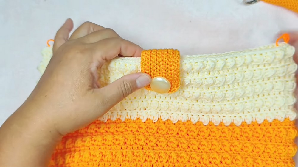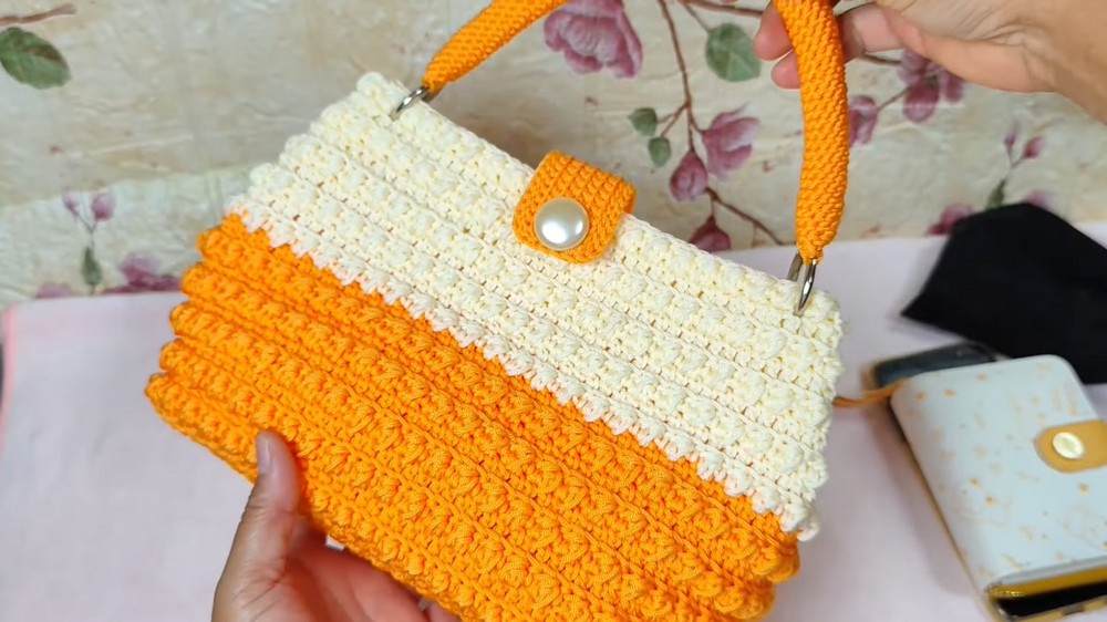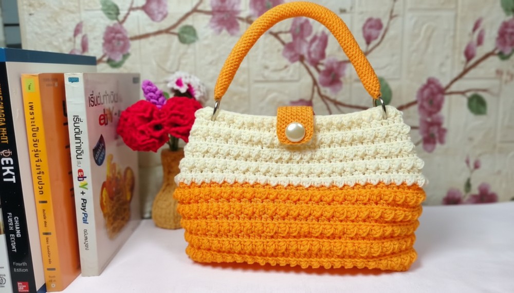 • Two colors: Orange for the bag base and initial rows, and cream (or any preferred complementary color) for the upper bag portion.
